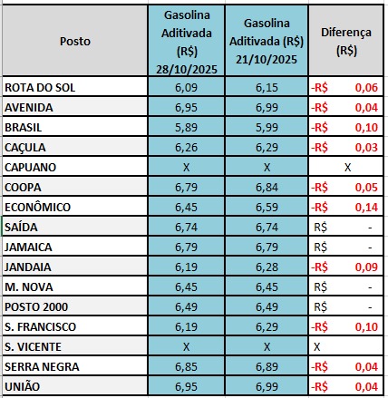 GASOLINA ADITIVADO – REDUÇÃO DE R$ 0,03 A R$ 0,14