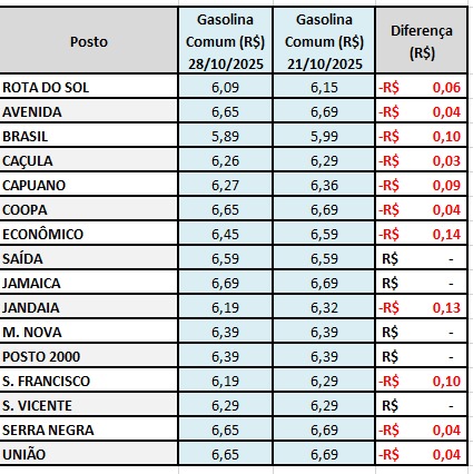 GASOLINA COMUM – REDUÇÃO DE R$ 0,03 A R$ 0,14