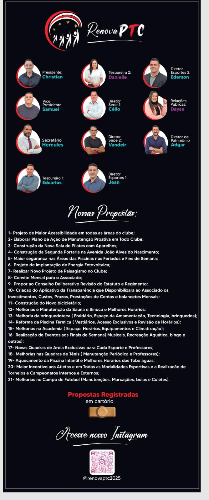Realmente é preciso renovar em todos senarios , a chapa 2, é uma continuação da administração anterior, fizeram muito pelo clube, mas, temos que dar oportunidades para novas ideias, a chapa 1, é a favorita, pessoas mais ativas no clube, um exemplo vejo o Dr.Hercules advogado, todos os dias na academia, vejo lá também, vários outros integrantes da chapa 1, já que chapa 2, não é tanto ativa no clube, entendo que a chapa 1, está mais envolvida com o clube e mais próximo dos associados! Eu voto chapa 1, e todos da minha família!