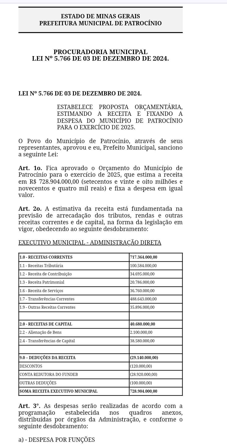 No último dia 3 de dezembro, a Prefeitura de Patrocínio sancionou a Lei nº 5.766, que estabelece o orçamento municipal para 2025.