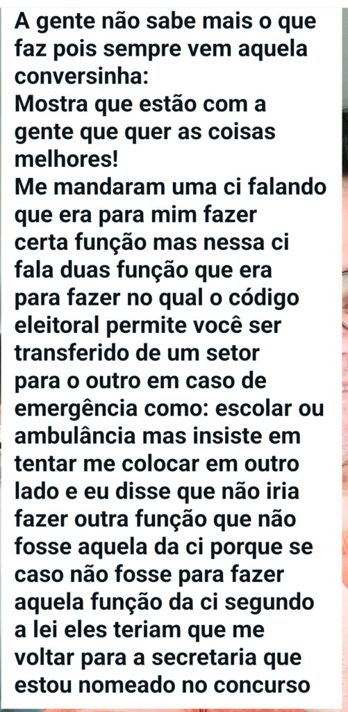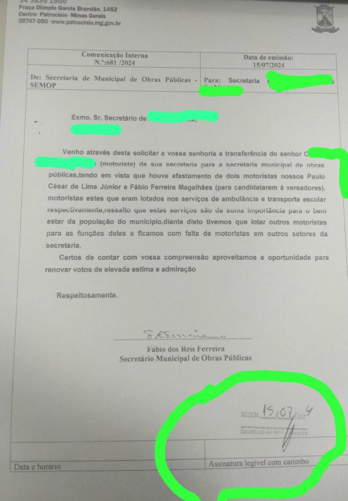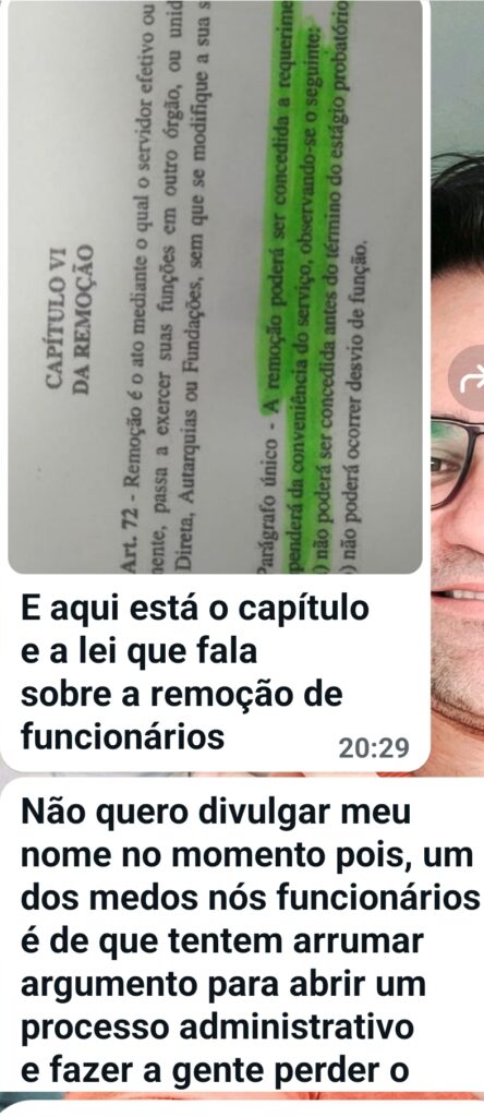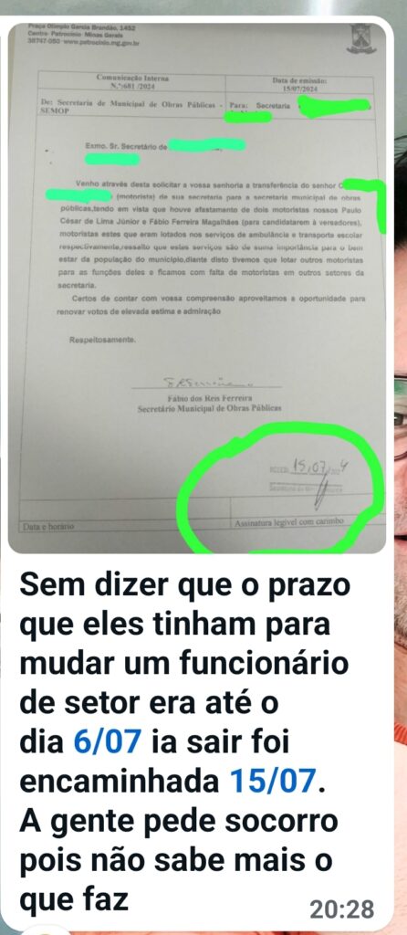 O servidor revela que a alegação para a sua transferência foi a necessidade de substituição de motoristas, já que outros funcionários da prefeitura, como o motorista de ambulância, afastaram-se para concorrer a cargos políticos em outras cidades.