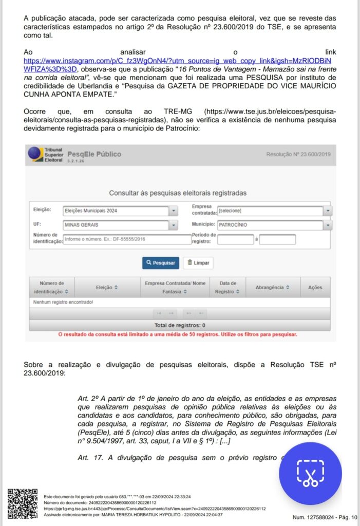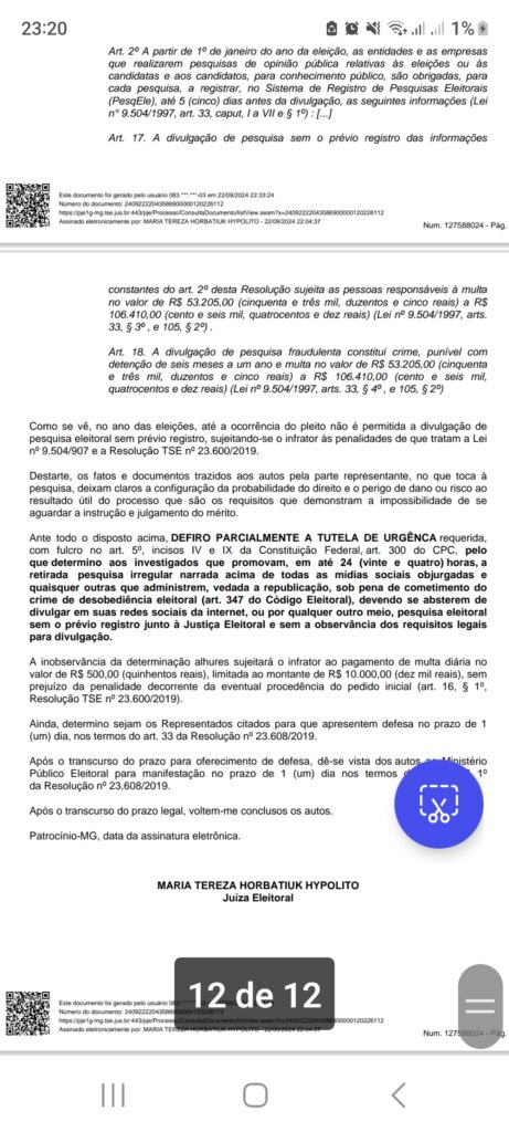 Diante dessa situação, a coligação “Uma Patrocínio Para Todos” acionou a Justiça, que rapidamente ordenou a retirada da pesquisa falsa, além de aplicar uma multa aos envolvidos.