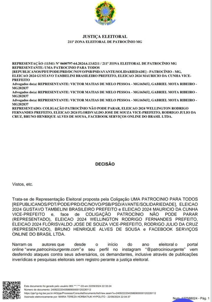Diante dessa situação, a coligação “Uma Patrocínio Para Todos” acionou a Justiça, que rapidamente ordenou a retirada da pesquisa falsa, além de aplicar uma multa aos envolvidos.