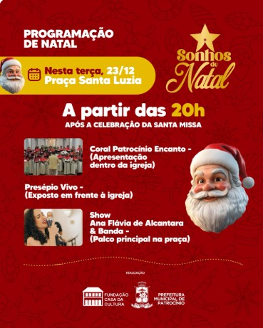 O governo municipal de Patrocínio mantém a programação dos Sonhos de Natal 2025 e promove, nesta terça-feira (23), mais uma noite de apresentações culturais na Praça Santa Luzia, após a celebração da Santa Missa.