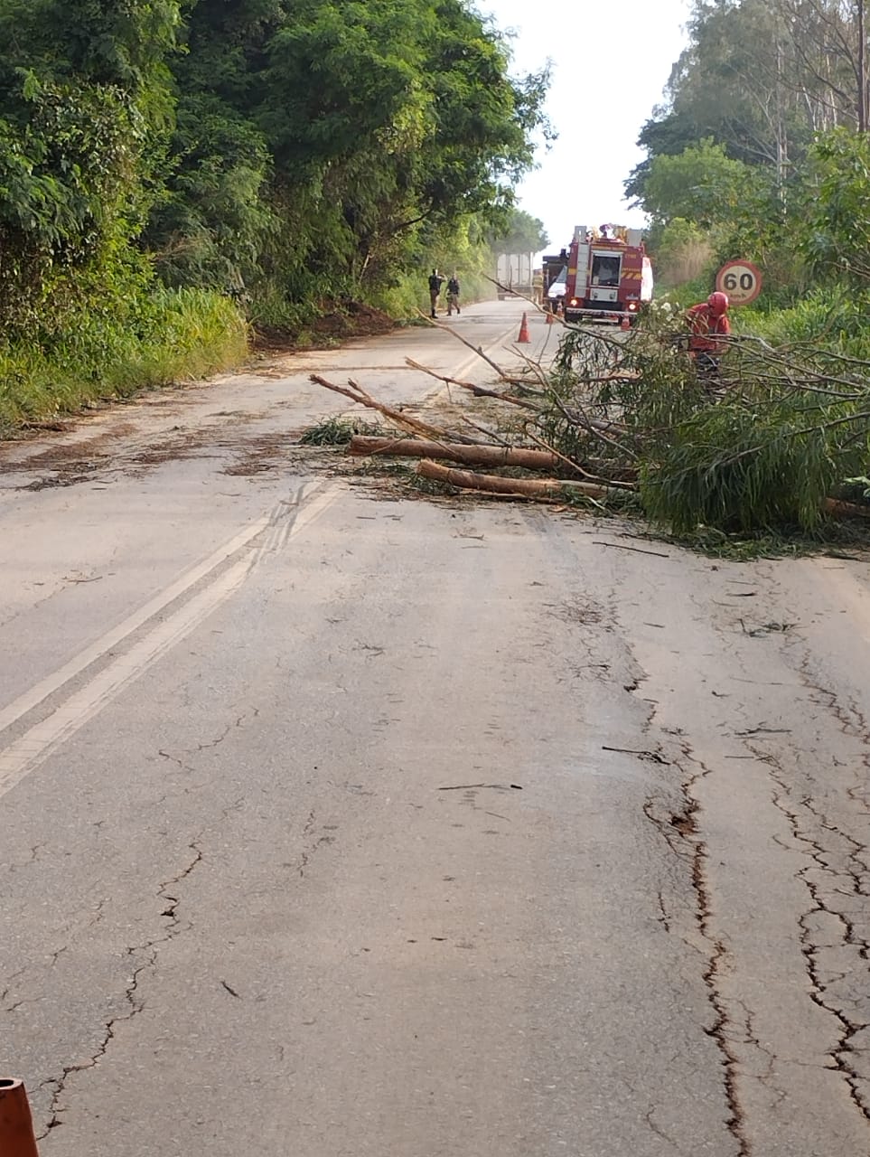 Condutor perde a vida ao desviar de eucalipto caído na pista; Bombeiros realizam retirada do corpo e liberação da via parcialmente interditada.