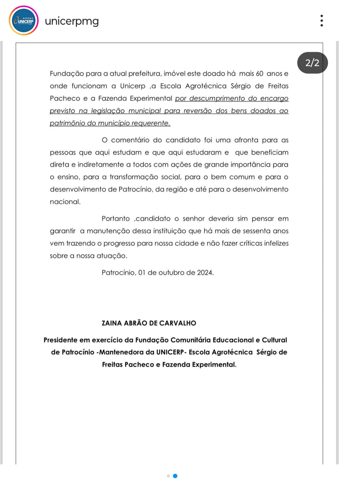 Em nota de repúdio divulgada pela presidente Zaina Abraão, a UNICERP expõe sua indignação frente às falas do candidato, que parecem ir muito além de críticas construtivas e tocam diretamente na integridade de uma das instituições mais importantes para a cidade de Patrocínio.
