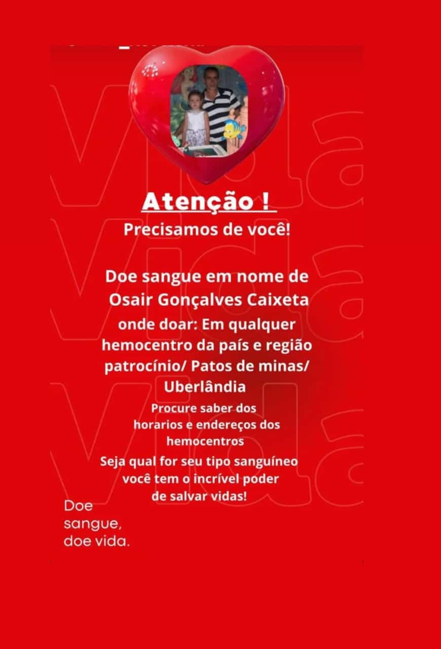 A situação de Osair é delicada e ele necessita com urgência de transfusões para se recuperar. A família, em estado de aflição, faz um apelo a todos que possam contribuir para salvar sua vida. Os interessados podem realizar a doação de sangue tanto na Santa Casa de Patrocínio quanto no HEMOMINAS, localizado dentro do Pronto Socorro Municipal de Patrocínio.